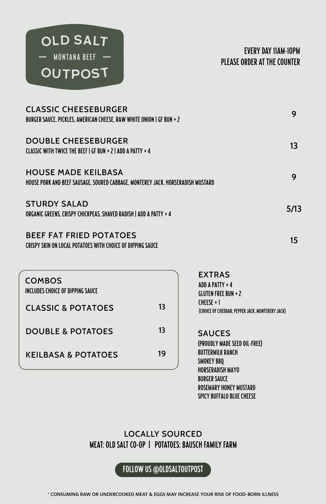 Old Salt Outpost is a simple, stellar burger shop located inside The Gold Bar in Downtown Helena, Montana. The beef is from our ranches and we source high quality local ingredients for our famous beef-fried potatoes, buns, salads, and bratwursts. Make sure to check out our seed-oil free dipping sauces!